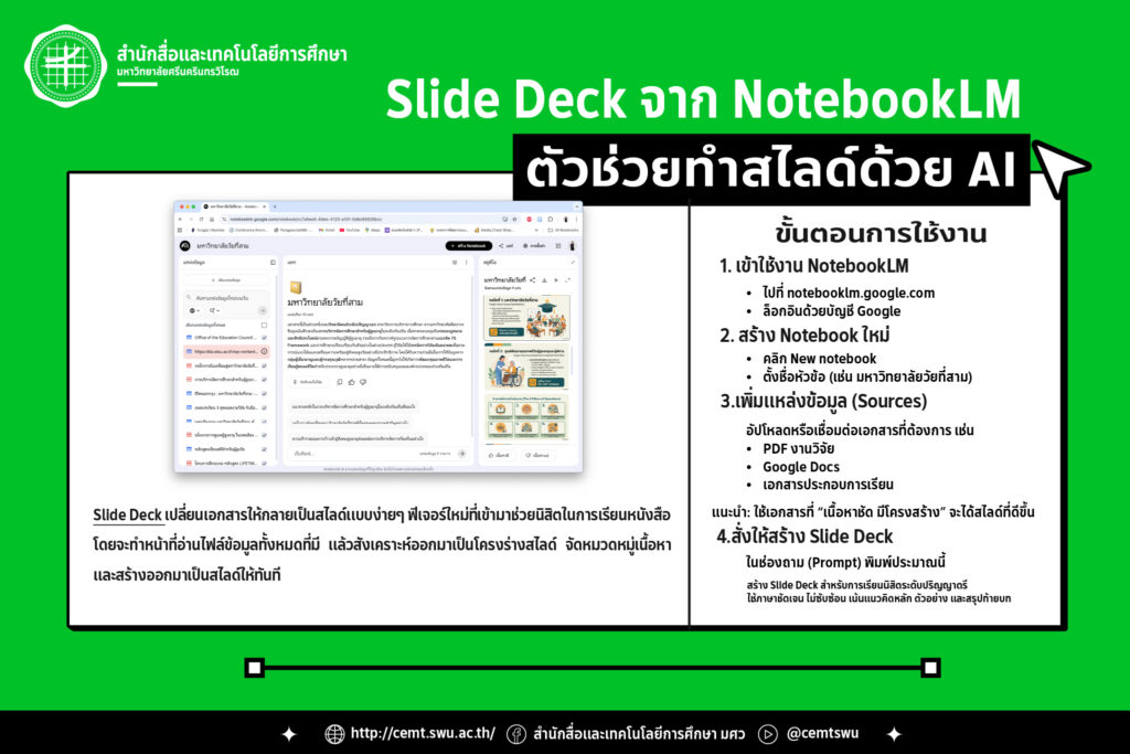 📚 EdTech Update 🎨 ขอเสนอสร้าง Infographic ง่ายๆ ด้วย NotebookLM แบบทีละสเต็ป 📚 EdTech Update 🎨 ขอเสนอสร้าง Infographic ง่ายๆ ด้วย NotebookLM แบบทีละสเต็ปAI จะช่วย “อ่านข้อมูล” จากไฟล์ที่เราให้ แล้ว “วาดออกมาเป็นภาพ” ในรูปแบบ Infographic ให้อัตโนมัติ ทำให้การสรุปข้อมูลเชิงภาพทำได้เร็วขึ้นมาก เหมาะกับการทำรายงาน สไลด์นำเสนอ หรือสื่อการเรียนรู้ 🛠️ 5 ขั้นตอนสร้าง Infographic ด้วย NotebookLM1️⃣ เข้าสู่ระบบ (Access)– เปิดเบราว์เซอร์ Google Chrome (แนะนำเพราะทำงานร่วมกับ Google Tools ได้เสถียร)– เข้าเว็บไซต์ 👉 notebooklm.google.com– ล็อกอินด้วย บัญชี Gmail2️⃣ สร้างสมุดโน้ตใหม่ (Create Notebook)– […]