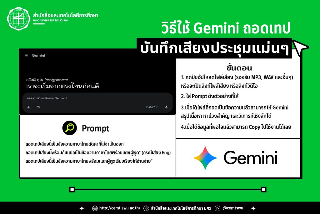 📚 EdTech Update ขอเสนอ ถอดเทปภาษาไทยไม่เพี้ยนด้วย Google Gemini EdTech Update ขอเสนอ ถอดเทปภาษาไทยไม่ต้องทรมานอีกต่อไป เมื่อ Google Gemini กลายเป็นผู้ช่วยเรียนรู้ยุค AI ข่าวดี Google Gemini เข้ามาเปลี่ยน “งานถอดเทป” จากภาระหนัก ให้กลายเป็นกระบวนการเรียนรู้แบบอัจฉริยะ โดยเฉพาะกับ ภาษาไทย ที่หลายแอปยังทำได้ไม่ดีนัก   จุดเด่นที่นิสิตต้องว้าว ถอดเสียงยาว 1–3 ชั่วโมงได้ในครั้งเดียว Gemini มีความสามารถพิเศษคือ เข้าใจบริบทระยะยาว หมายความว่า ไฟล์บรรยายทั้งคาบ สัมภาษณ์เชิงวิจัย เสวนาหลายคนพูดทับกัน อัปโหลดครั้งเดียว ได้ข้อความครบ ไม่หลุดประเด็น   วิธีใช้งานง่ายมาก (นิสิตทำเองได้แน่นอน) Step อัปโหลดไฟล์หรือวางลิงก์ รองรับทั้ง ไฟล์เสียง (MP3, WAV ฯลฯ) ลิงก์ไฟล์ออนไลน์ ลิงก์ YouTube   […]