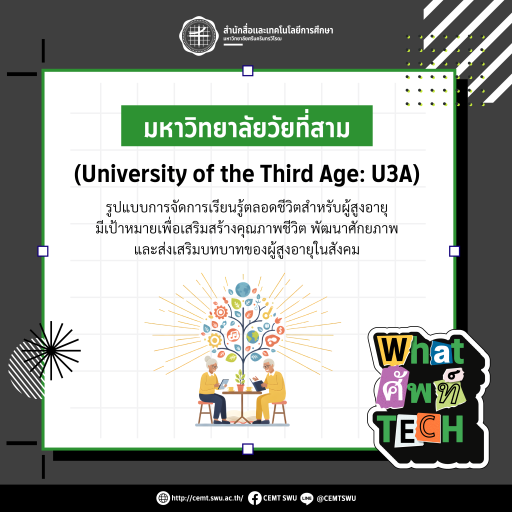 What ศัพท์ TECH ขอนำเสนอ 🎓 มหาวิทยาลัยวัยที่สาม (University of the Third Age: U3A) 🌱 What ศัพท์ TECH ขอนำเสนอ มหาวิทยาลัยวัยที่สาม (University of the Third Age: U3A) การจัดการศึกษาแบบ U3A นั้นมีความโดดเดนที่สามารถยืดหยุ่นรุปแบบให้เหมาะกับความสนใจและความต้องการของผู้เรียนได้ เน้นให้ผู้เรียนมีความสุขและมีคุณภาพชีวิตที่ดีขึ้นอย่างยั่งยืนประกอบไปด้วย 3 แนวคิดหลักคือ แนวคิดกิจกรรมนอกขอบเขตมหาวิทยาลัย (An extramural University Activity) แนวคิดการแบ่งปันความรู้และการเรียนรู้โดยไม่ผ่านการศึกษาในระบบอย่างเป็นทางการ แนวคิดการรู้หนังสือแบบเบ็ดเสร็จ (Functional Literacy) ขอขอบคุณข้อมูลจาก พจนานุกรมศัพท์การศึกษาร่วมสมัยชุดการศึกษาตลอดชีวิต ฉบับราชบัณฑิตยสภา (2568)#Whatศัพท์Tech #ทีมมศว #สำนักสื่อและเทคโนโลยีการศึกษา #CEMT #EdTech